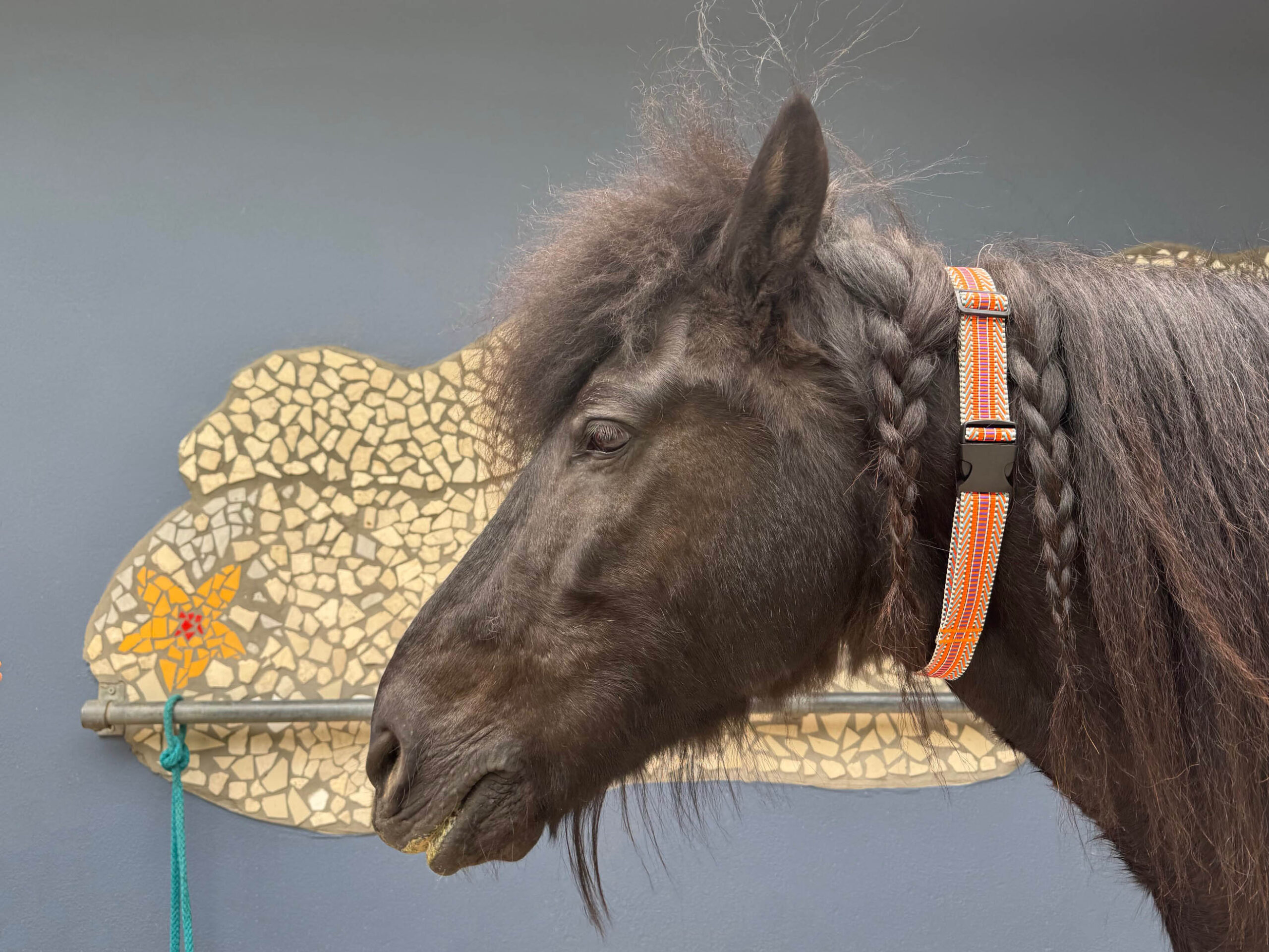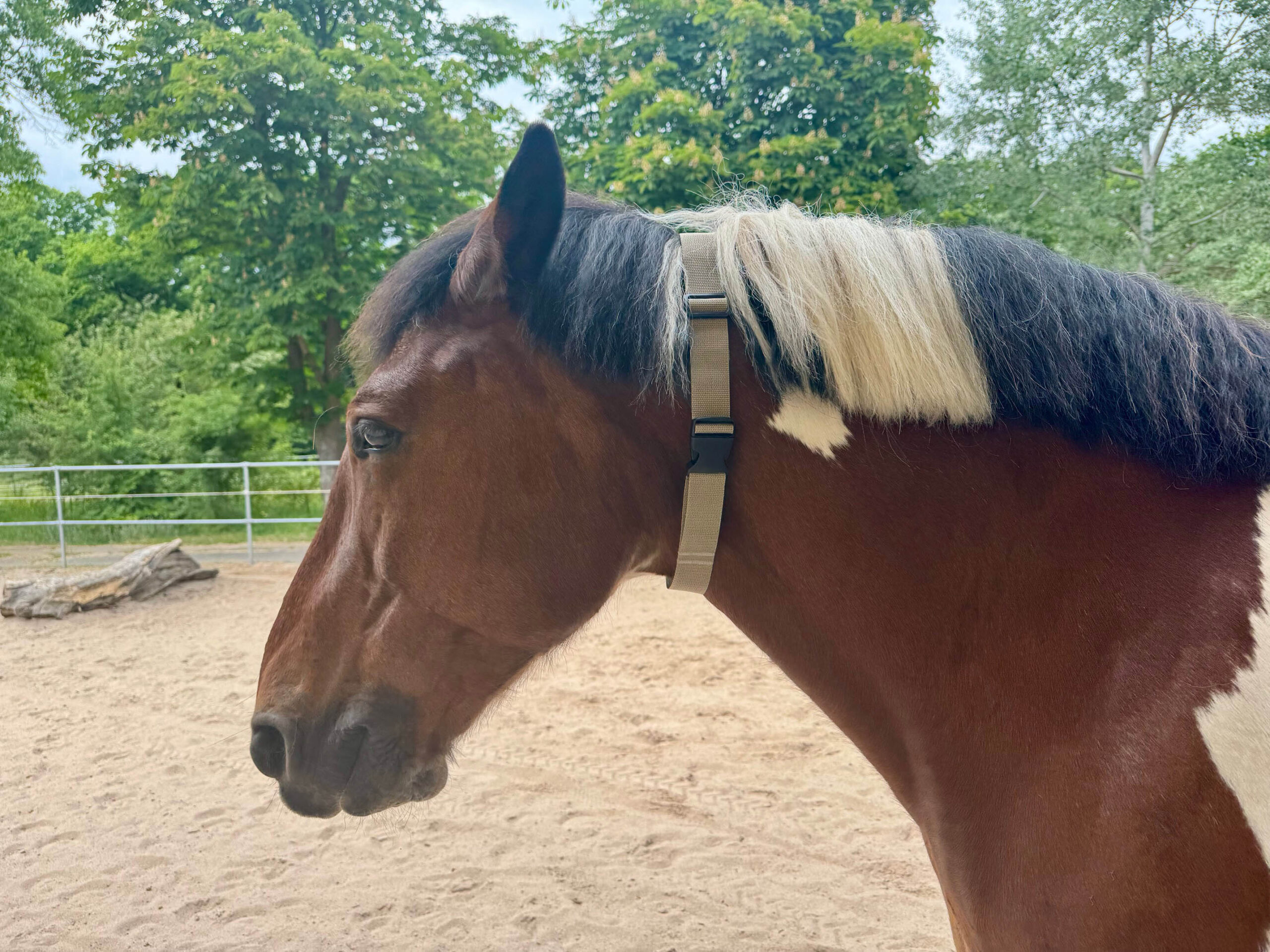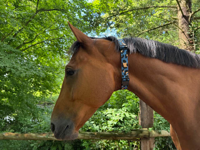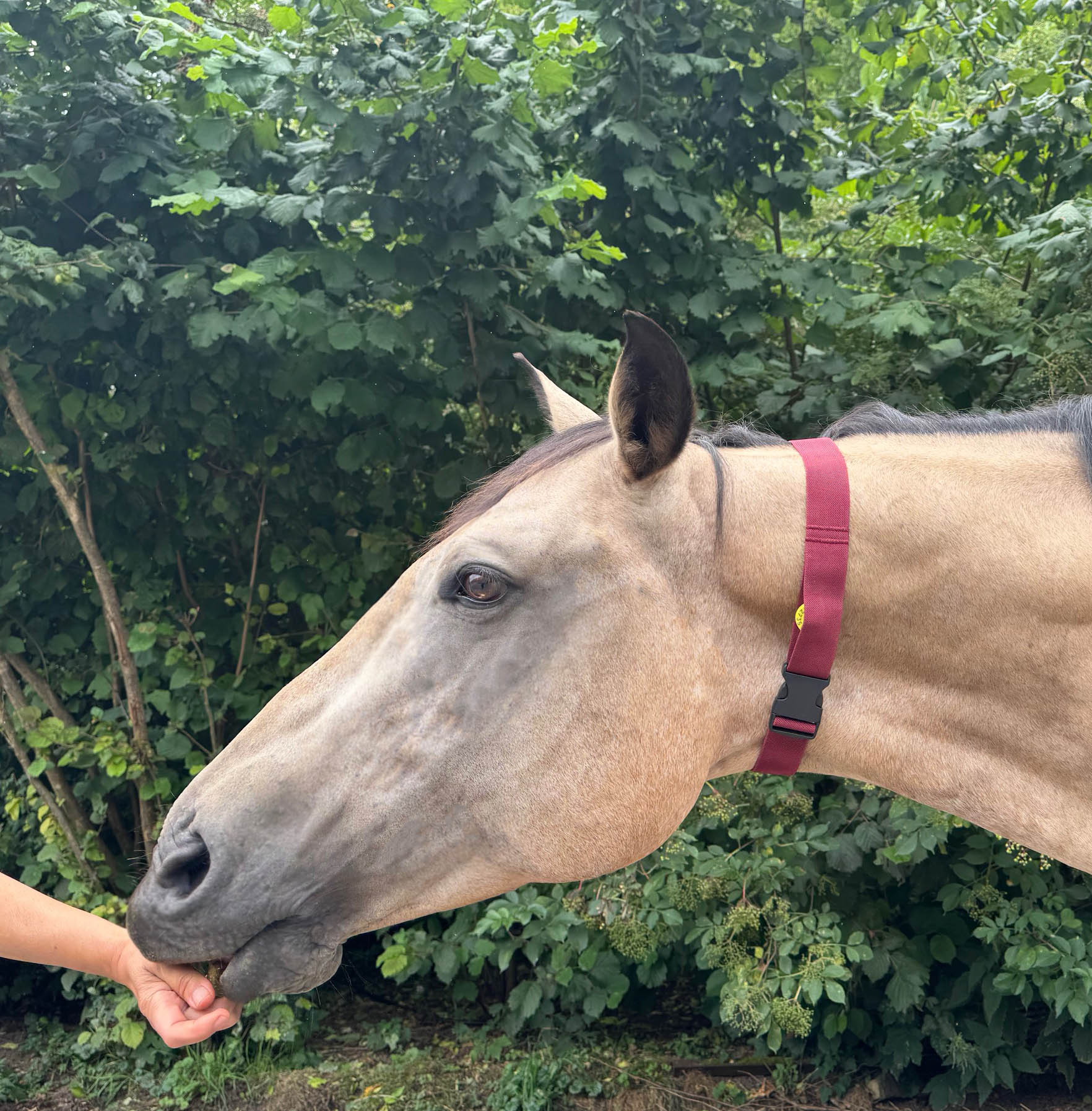 Wichtig: bitte belasse auf dem Foto die verwendete Halsband-Länge wie sie dein Pferd trug. Muss der Verschluss z.B. getauscht werden, könnte das Gurtband kürzer werden.