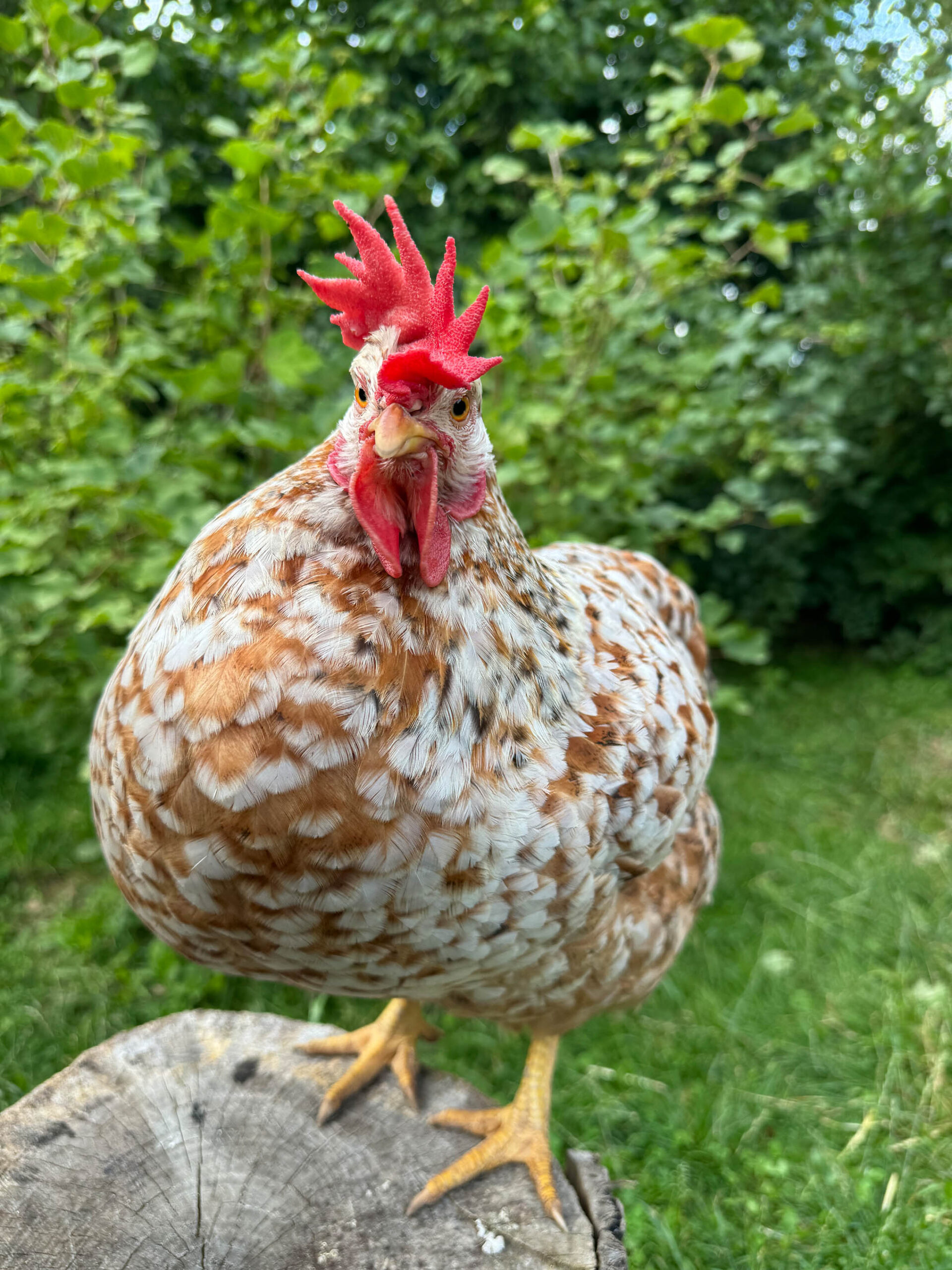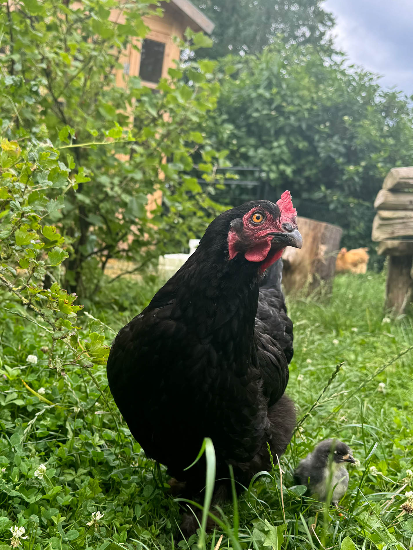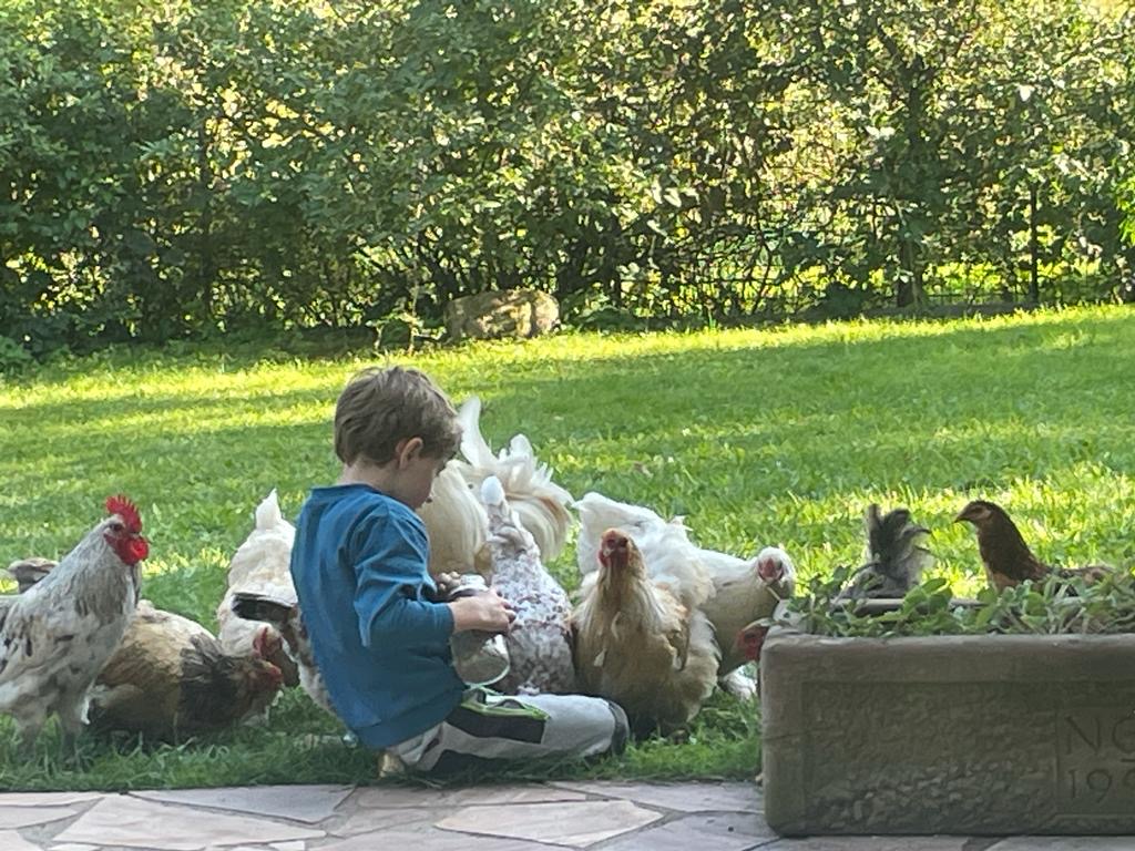 Unser Hahn Mr. Grey führt seine Damen mit Stolz über das Hofgelände oder lädt zum Ausflug in den Wald ein. Vergnügen kennt eben keine Grenzen! Wer sich bei unseren gefiederten Freunden beliebt machen möchte, darf gerne ein paar Sonnenblumenkerne mitbringen. Damit gewinnt man schnell die Herzen unserer bunten Hühnerschar und wird lobend als Ehrengast des Tages begackert. Jedes unserer Hühner darf bei uns ein lebenslanges Zuhause genießen.