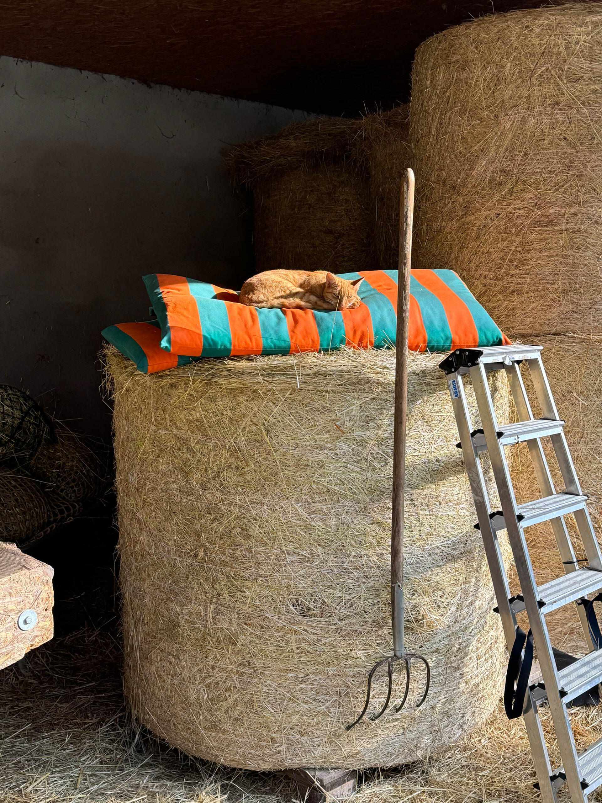 Unsere Katzen sind die entspannten Seelen unseres Hofes. Nach nächtlichen Abenteuern sieht man sie oft gemütlich auf einem Heuballen liegen. Ihrer Mission „profiter de la vie“ stets treu, sind sie immer bereit für Streicheleinheiten – die beiden Freigeister genießen ihr sorgenfreies Leben. Fallen Nachtdienste an, ist es immer wieder amüsant zu beobachten, wie Cleo und Charlie mich dabei auf Schritt und Tritt begleiten. Erst wenn ich wieder im Haus bin, scheinen sie ihren selbst auferlegten Auftrag als Begleitkatzen erfüllt zu haben.