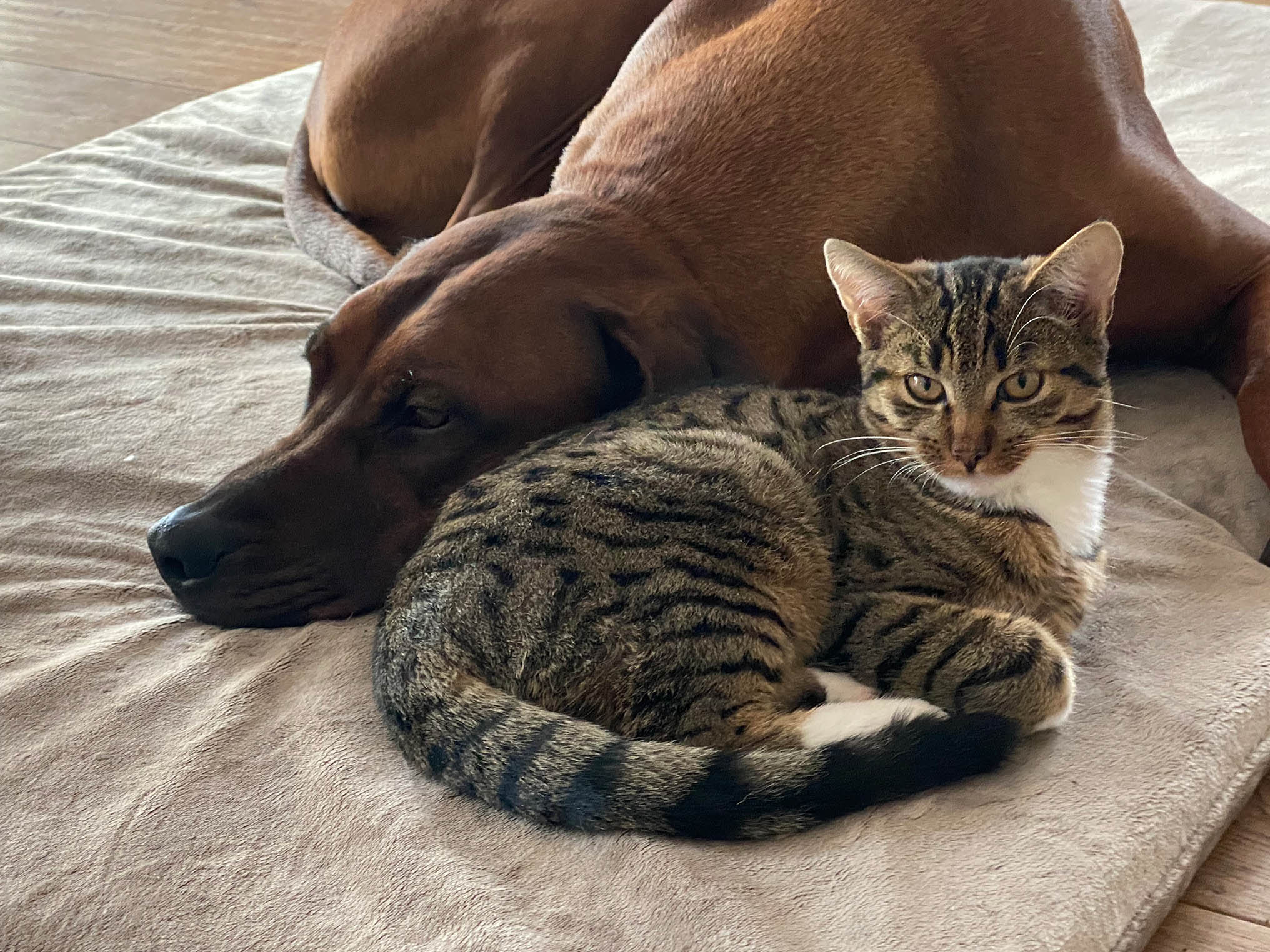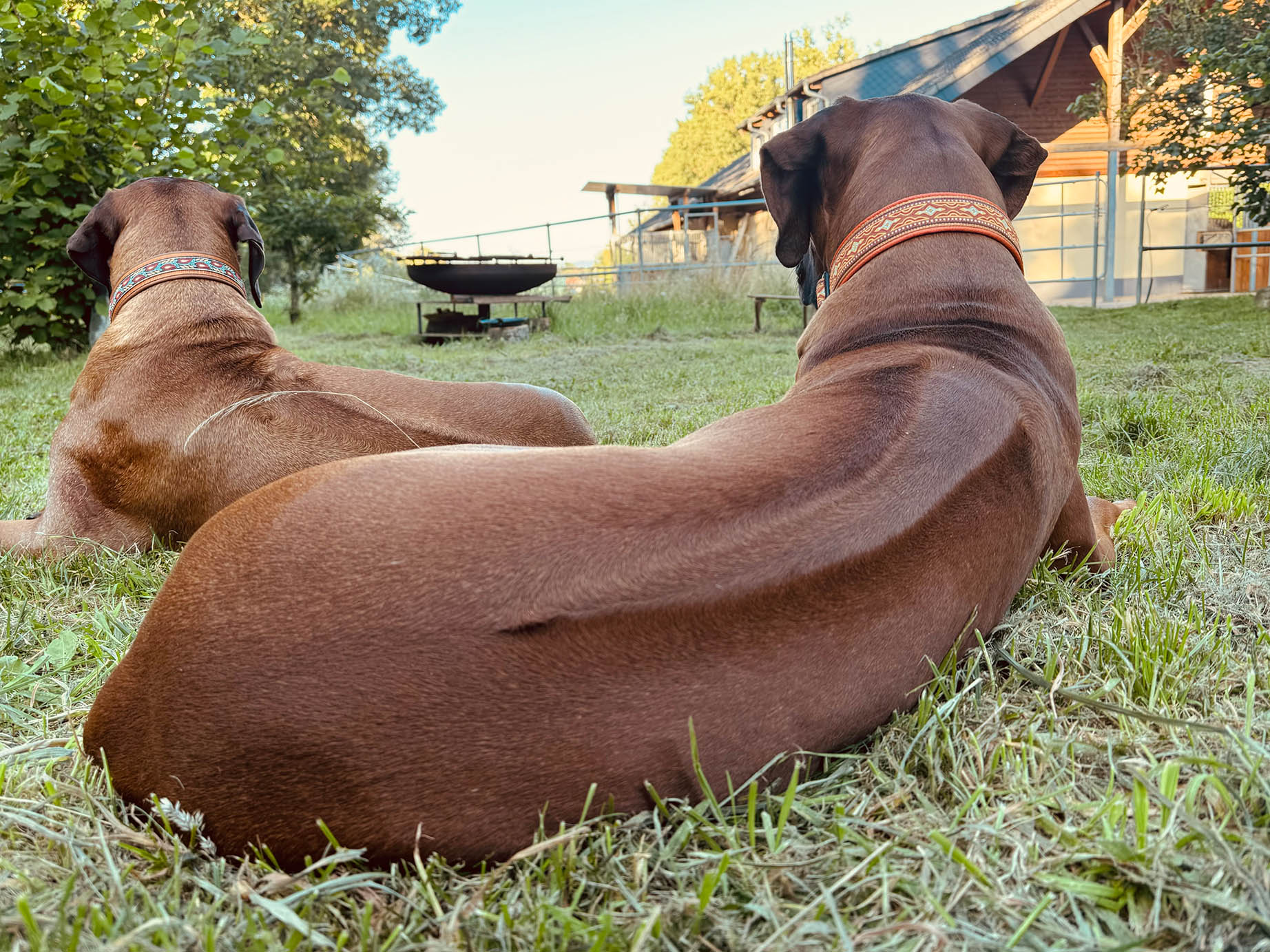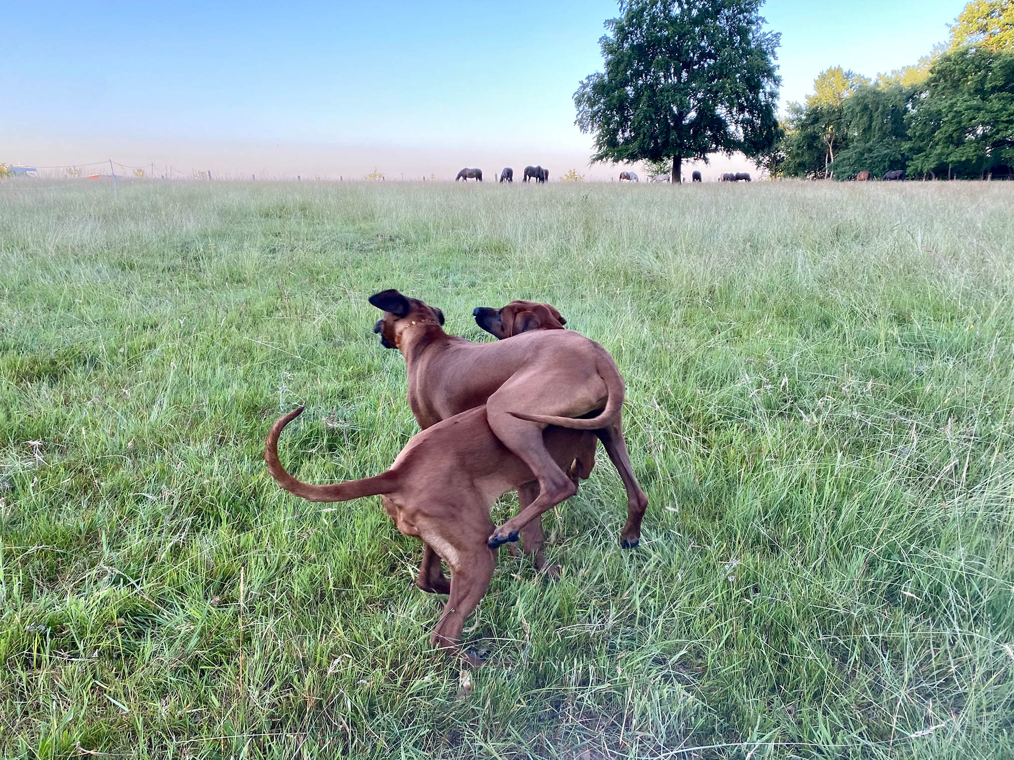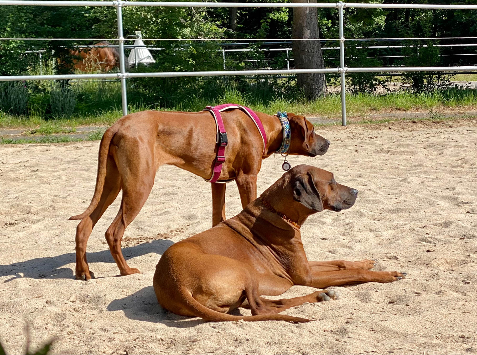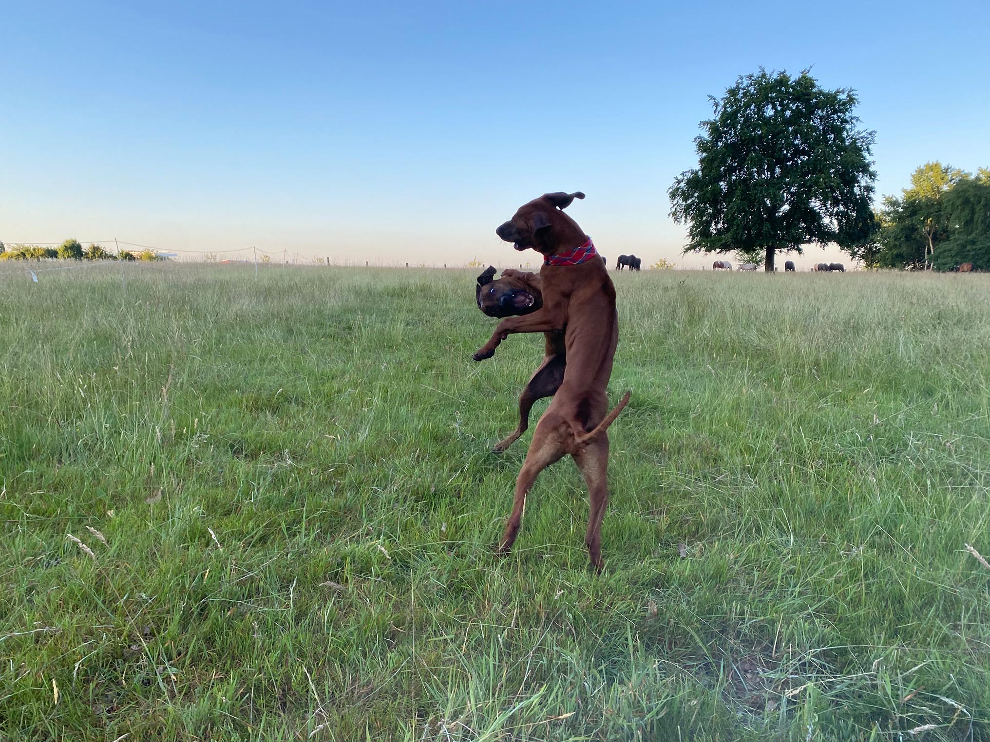 Unsere zwei Rhodesian Ridgebacks sind nicht nur Familienmitglieder, sondern erfüllen auch ihre Jobs als Arbeitshunde. Unerschrocken und blitzschnell übernehmen sie die wichtige Aufgabe, für die Sicherheit unseres Hofes und unserer Pferde zu sorgen. Ihrer Familie gegenüber äußerst loyal, zeigen sie sich Fremden gegenüber reserviert. Unsere energiegeladenen Afrikanischen Löwenhunde benötigen täglich körperliche sowie geistige Auslastung, werden roh-biologisch gefüttert und über positive Verstärkung trainiert.